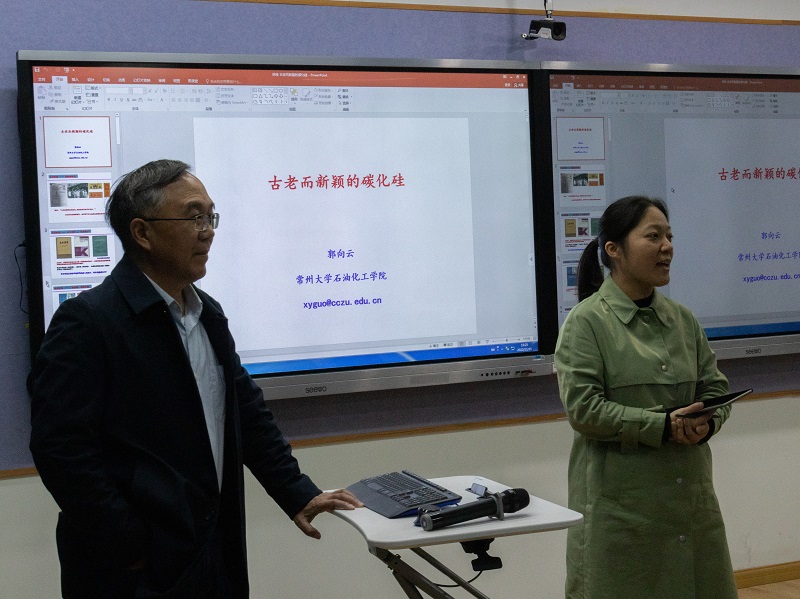 郭向云向同学们分享了自己大学、研究生时期求知求学的经历,以“化学领域里几乎所有规律都被前人发现,我们还能做什么”的问题为引,指出在发现新事物的过程中要怀揣好奇、积极探索、敢于联想、尝试创新、主动实践。鼓励同学们广泛涉猎不同学科领域的知识,找到自己的兴趣所在;建议同学们要保持思考、敢于质疑,要勇于提出自己的观点和看法。接着他围绕“碳化硅性能好,为什么前人不用其做催化载体”的问题,结合自己在研究碳化硅时的经历、见闻,向同学们介绍了碳化硅的发现过程、用途、性质及他的团队研究成果——一种碳化硅介孔材料及其制备方法。在座的同学们纷纷感叹于碳化硅的神奇。
