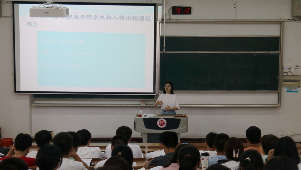 9月6日下午,学院于W15阶开展“本科学籍与课程化管理规定”讲座,旨在帮助新生了解课程体系,熟悉课程安排,清楚课程设置,讲座由学院教务秘书洪逸群主讲。洪逸群向新生介绍了2023级学生的课程体系,详述了学分制度,帮助新生区分了必修课和选修课,同时围绕培养方案中的课程设置、课程时间安排,介绍了选课的基本流程和操作方法。此次讲座有助于新生正确选择修读课程,科学规划学业。