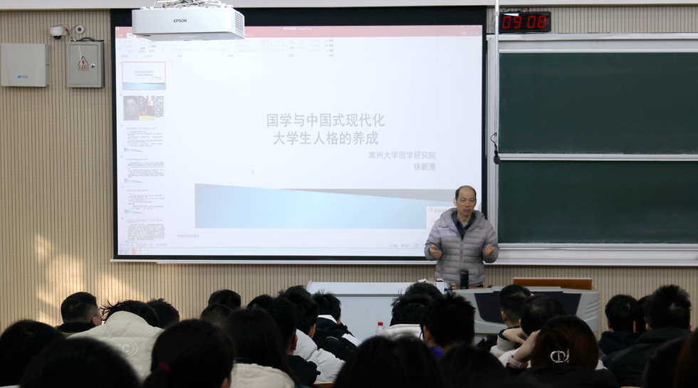 徐新意以孙卫东的事例引入,介绍了中国式现代化教育对人格养成的意义,呼吁同学们要重视道德修养。徐新意指出国学是中国人经过几千年实践总结而得出的为人处事的道理和智慧,讲解了国学的基本内容和经典名句,希望同学们能够从中借鉴学习,并向同学们分享了自己研究国学的最终意义:让更多人能读懂国学作品,建立起中国人以及中华民族的文化自信。在对国学相关作品的解读上,徐新意以厅级官员王某某受贿事例引出“孔子讲五仪”,告诫同学们莫要成为困而学之甚至困而不学的“庸人”,要“力行”“仁义”“忠信”“自强”,靠自身努力成为“士人”。