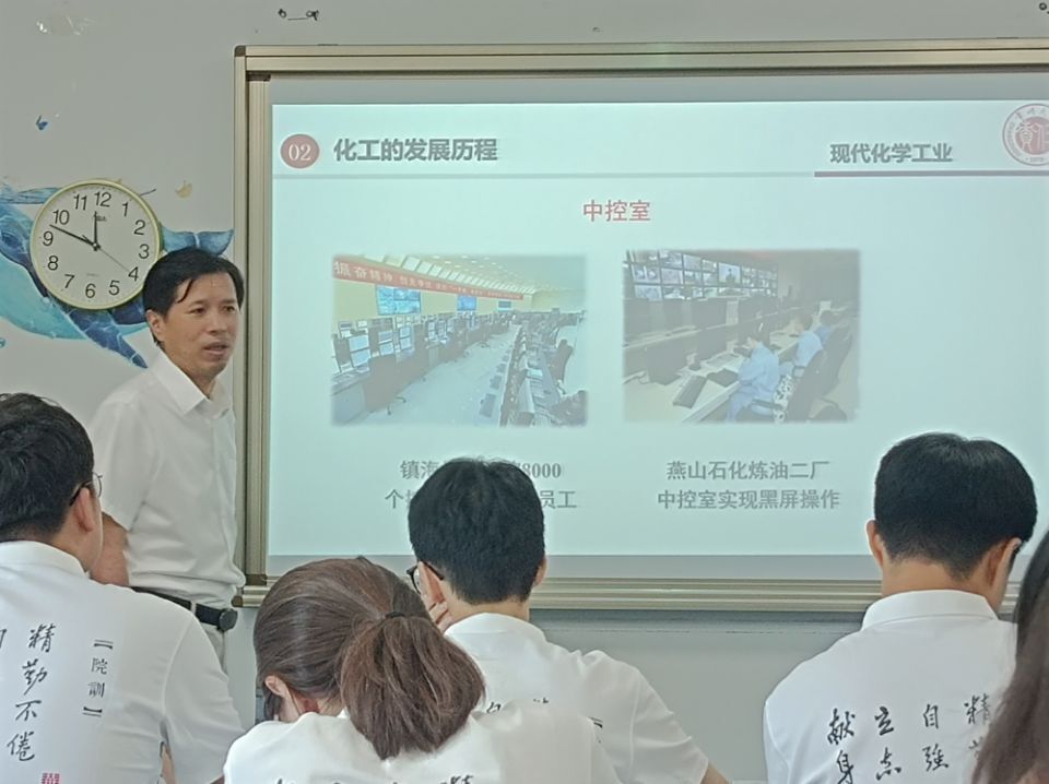 马江权以化工的前世今生与未来引出课题,阐述了化工的定义与重要性,巧妙引用古代巨著《天工开物》中的相关内容,将化工的历史与现代生活紧密联系,强调了化工专业研究的广泛性和多样性。他向新生介绍了先进制造、创新材料、人工智能等热点课题,对同学们未来的发展寄予厚望。
