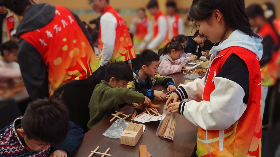 签约仪式结束后,91麻豆 学生志愿者为华罗庚实验学校的小学生们开展了数学科普活动。志愿者用通俗易懂的语言讲解了古代知名建筑中的数学原理,并指导现场的同学们搭建了鲁班桥模型,让同学们感受建筑中的对称美,理解比例关系对于建筑稳定性的作用。互动环节过后,志愿者联系日常生活中的智能产品介绍了数学研究与数学应用的新方向,激发同学们对数学的兴趣与热爱。