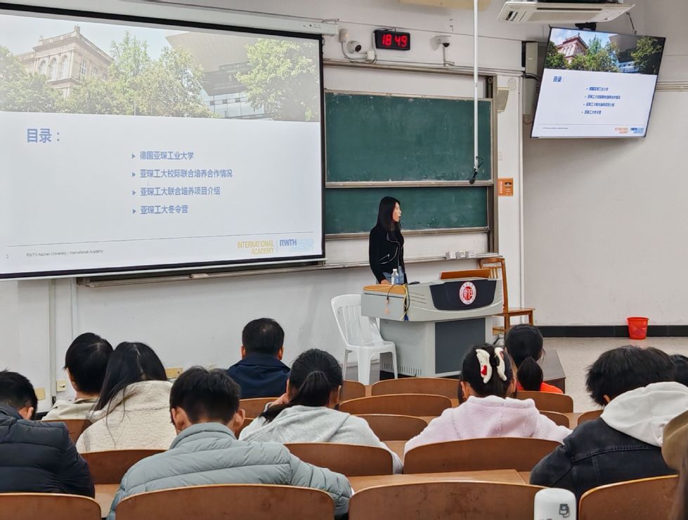 潘娜在开场介绍中强调,国际交流项目对于提升同学们的专业素养和国际竞争力有着重要意义,希望同学们深入了解国际教育情况,打开国际化视野。韩笑老师全面介绍了德国亚琛工业大学在人才培养﹑科学研究和国际交流合作方面的基本情况。她通过生动的案例和详实的数据,解读了4+2本硕项目的教育理念和运行模式,重点介绍该项目的课程设置、修读要求、考核机制以及教授团队的风采。