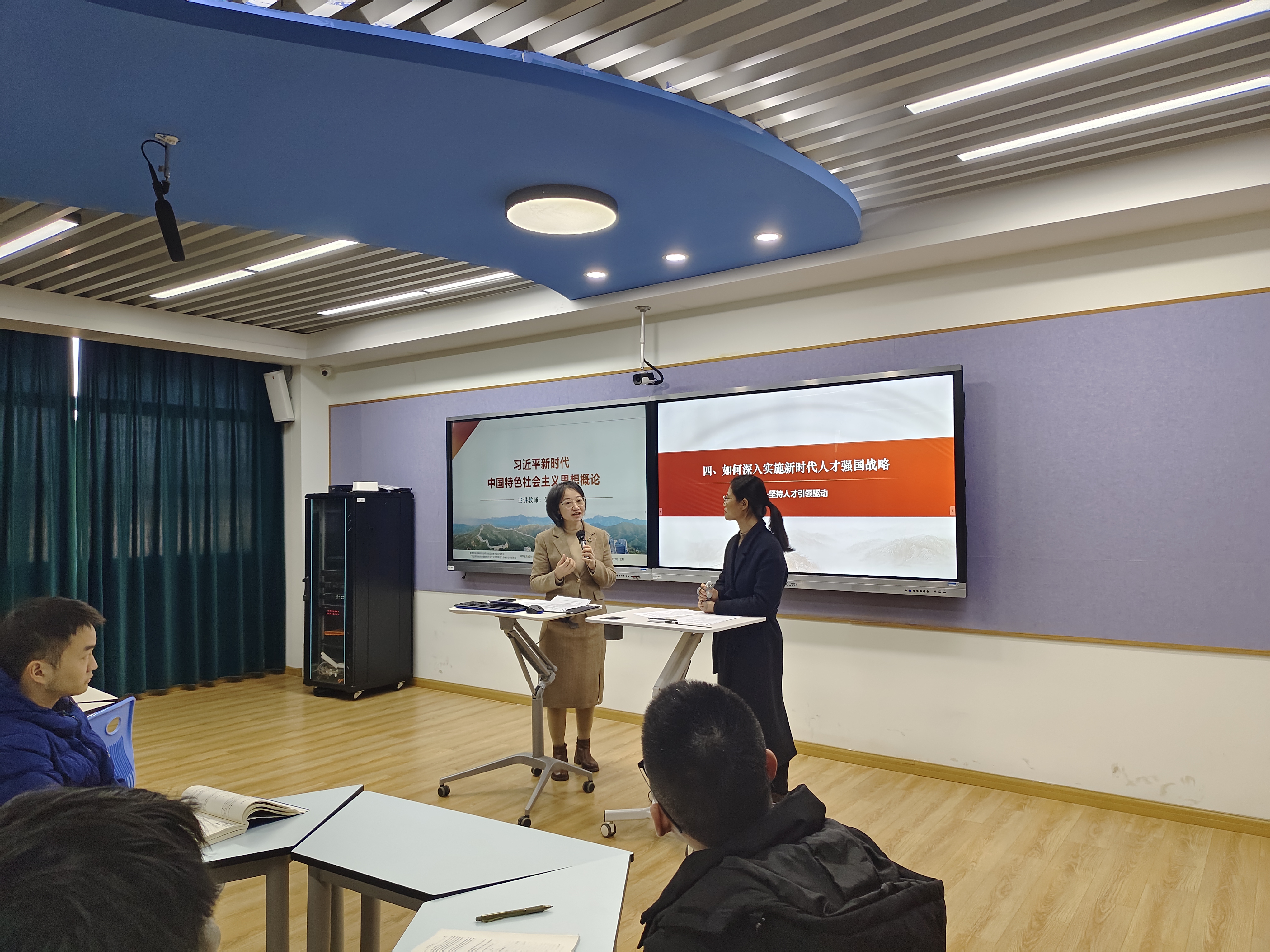 传统的单向讲授被默契的双师对话取代。朱霁老师从“千秋基业,人才为先”起笔,勾勒国家战略的宏大框架;当她阐释“教育、科技、人才三位一体”时,潘娜老师顺势接续:“在华院,我们正以‘小班化、个性化、导师制’将这一理念落地。”一席对话,在理论高度与实践深度间架起桥梁。当学生抛出“国家战略如何转化为个人路径”的困惑时,朱霁老师从价值引领层面升华立意,潘娜老师则同步拆解培养方案中的“交叉融合学习计划”,为学生提供清晰的行动路线。这场思想的“协奏”,让课堂焕发全新活力。