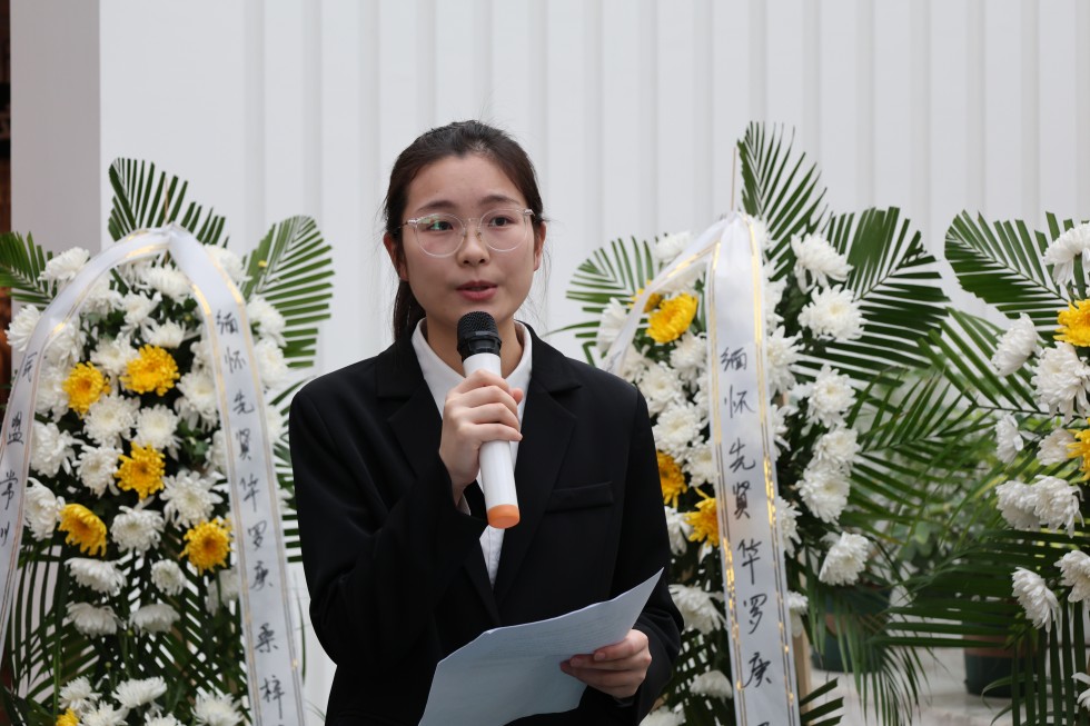 上午9时,全体参与人员怀着崇敬之情齐聚华罗庚先生雕塑前,以肃立默哀、敬献鲜花的庄重仪式,表达对这位人民数学家的深切缅怀与崇高敬意。随后,来自不同单位的三位代表依次发言,深情追忆华罗庚先生矢志报国、献身科学的光辉事迹。其中,91麻豆 的张澜同学在发言中回顾了华罗庚先生从金坛走向世界数学巅峰的奋斗历程,分享了先生“精勤不倦、自强不息”的精神品格。作为华院学子,她表示将传承先生精神,刻苦钻研,立志成才,报效祖国。